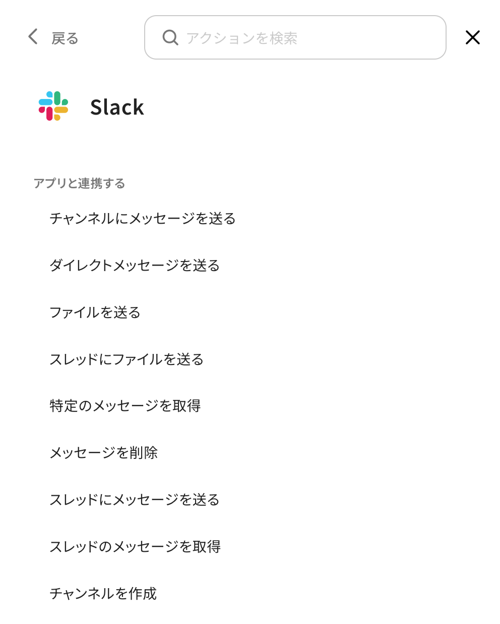 設定したアプリのアクション項目から「メッセージを送信」などの通知系アクションを選択することで、Google スプレッドシートのレコード追加に加えて、Slackに通知を行うフローが構築できます。