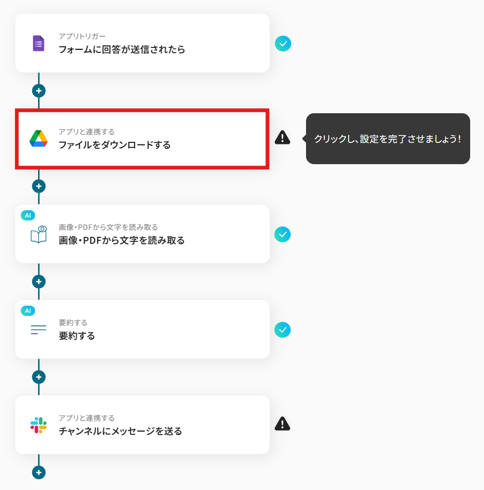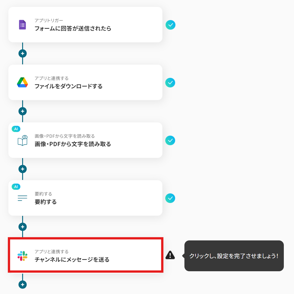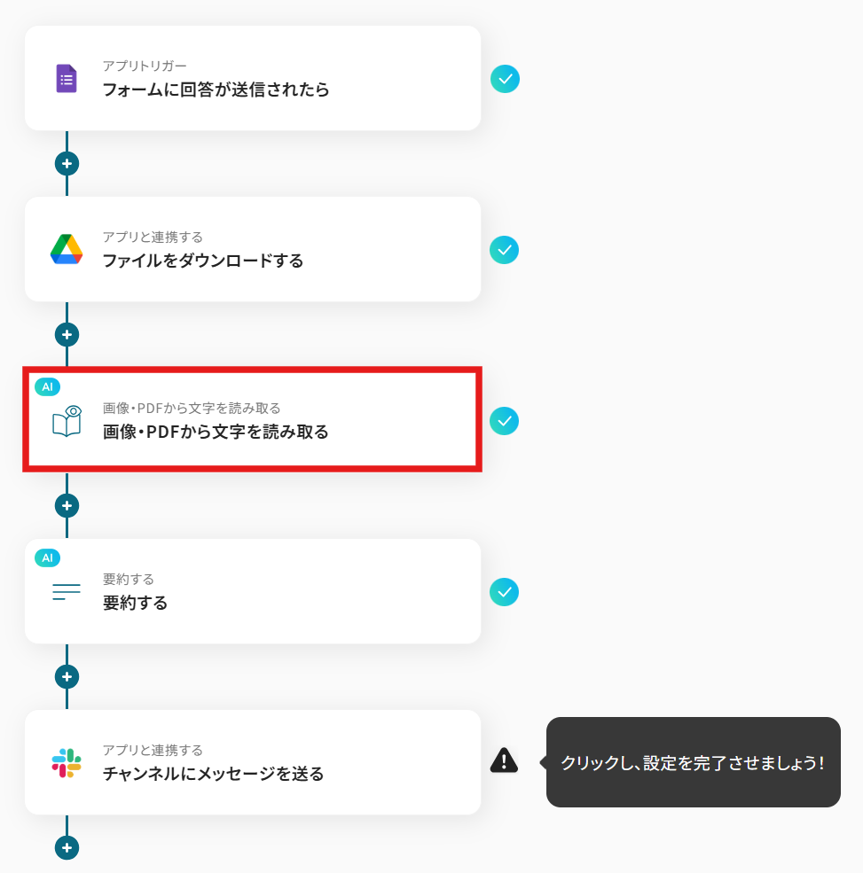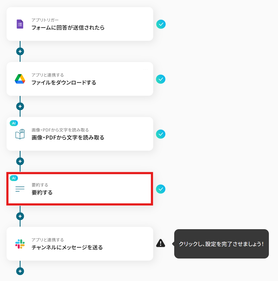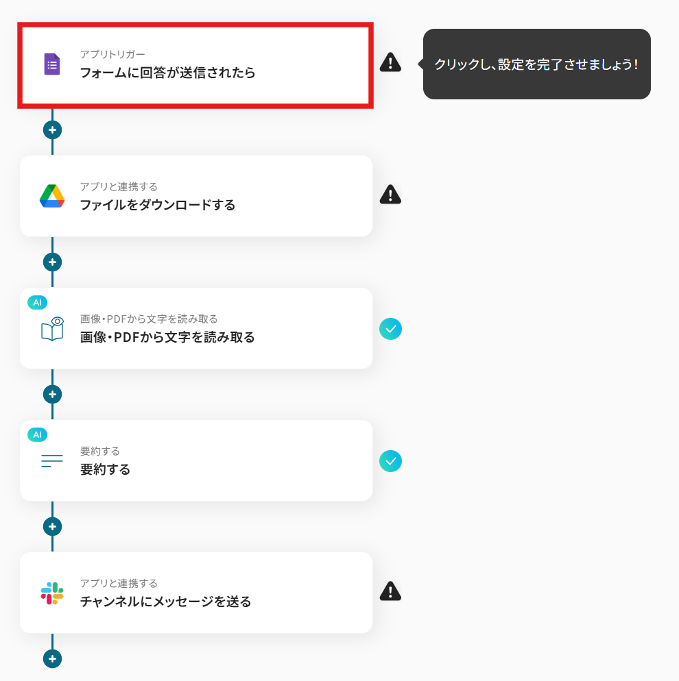 - Googleフォームのトリガー設定、OCR・AI要約・Slackのアクション設定