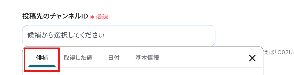 投稿先のチャンネルID:入力欄をクリックすると候補が表示されるので、その中から選択しましょう。