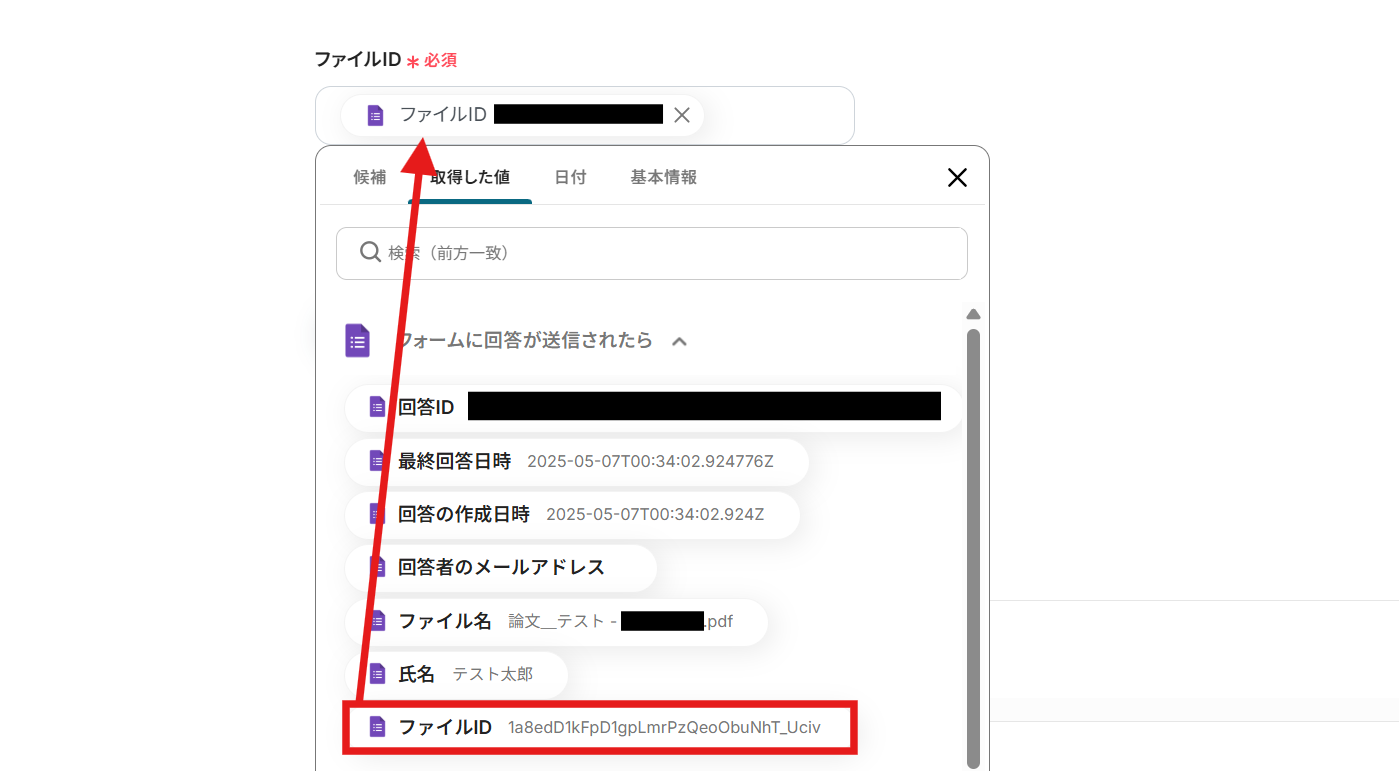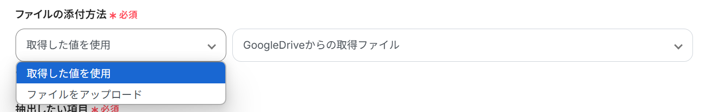 ファイルの添付方法:プルダウンで「ファイルをアップロード」か「取得した値を使用」か選択できます。今回は「取得した値を使用」を選択しています。