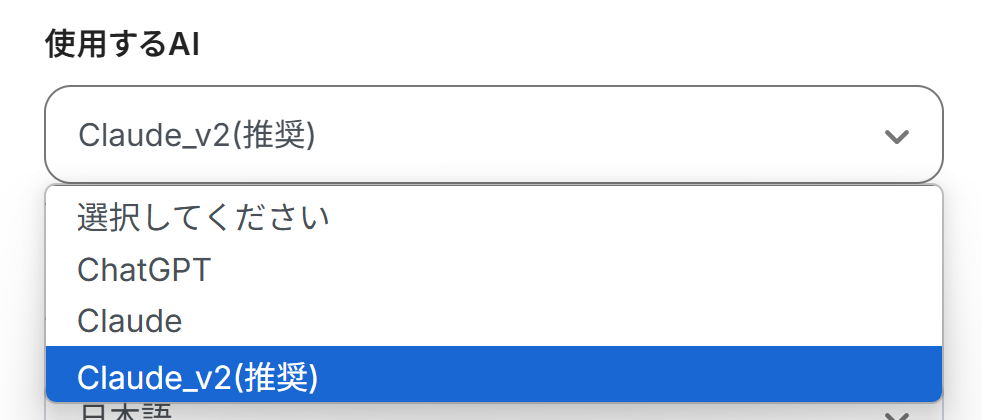 使用するAI:プルダウンから選べるようになっています。初期設定ではClaude_v2が選ばれているので、今回はそのまま使って進めていきましょう。