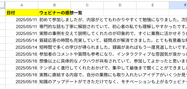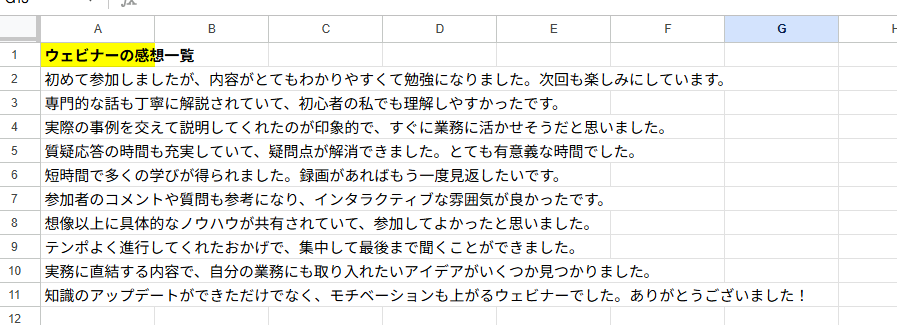 今回は、ウェビナーの感想一覧が入っているデータをすべてまとめて要約するため、「空ではない」としています。