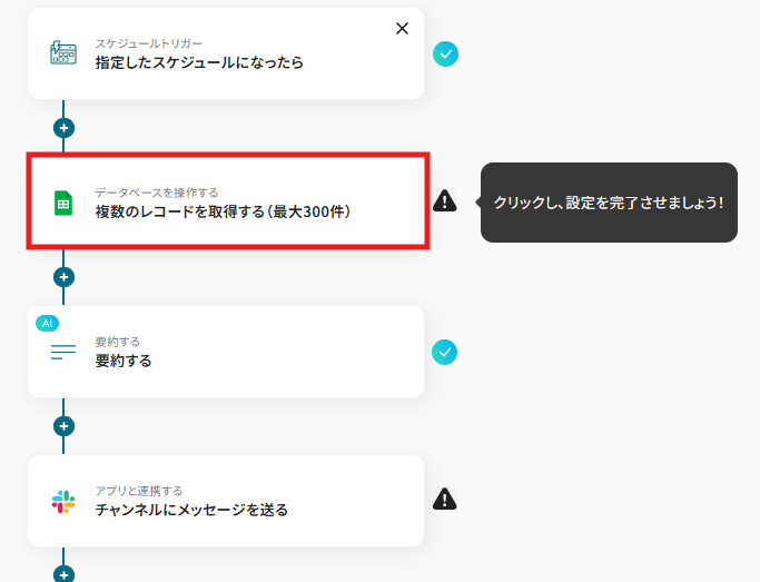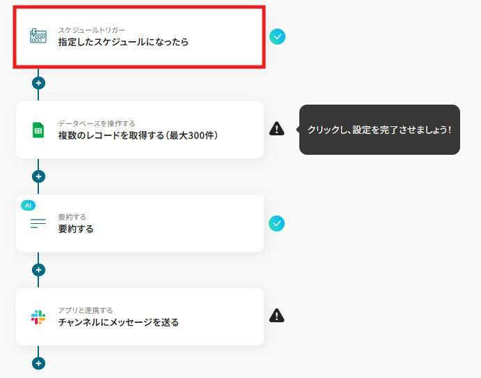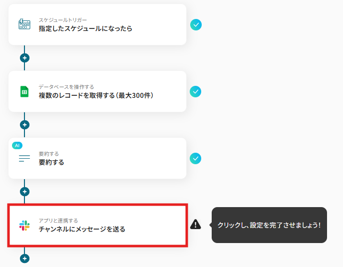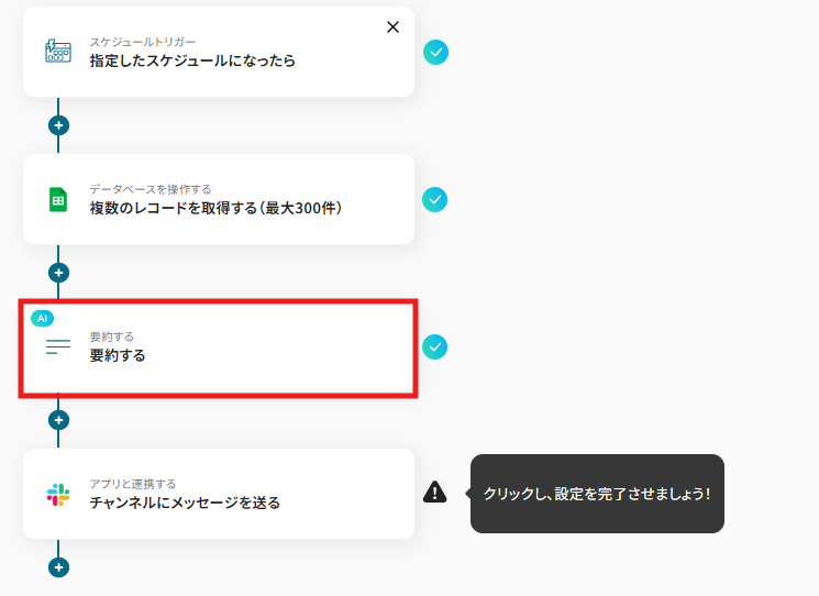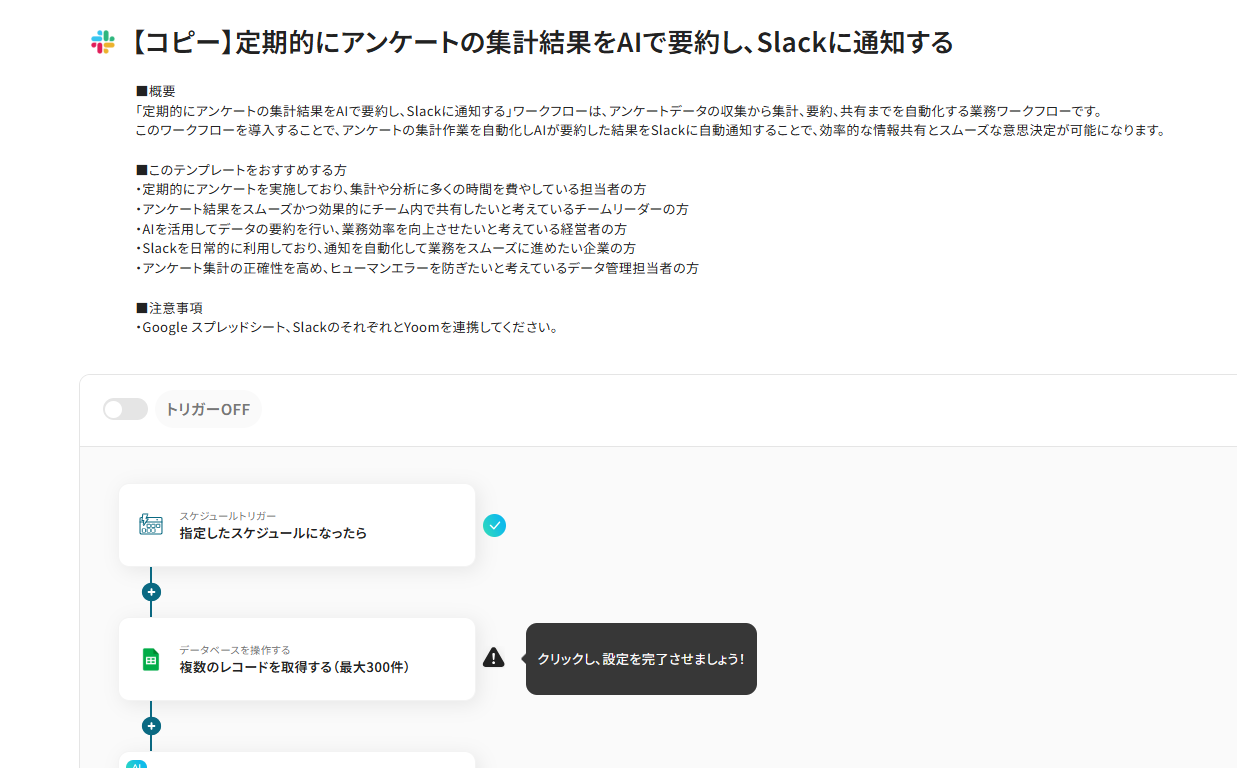 これで【定期的にアンケートの集計結果をAIで要約し、Slackに通知する】というフローが完成です。