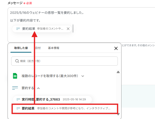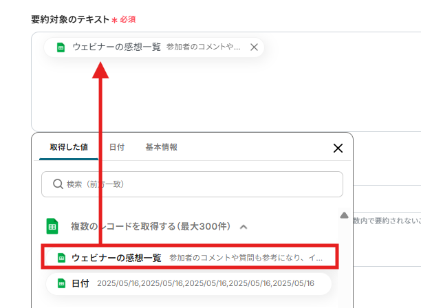 3)対象のテキストはアウトプット情報を活用して「ウェビナーの感想一覧」を入力してください。