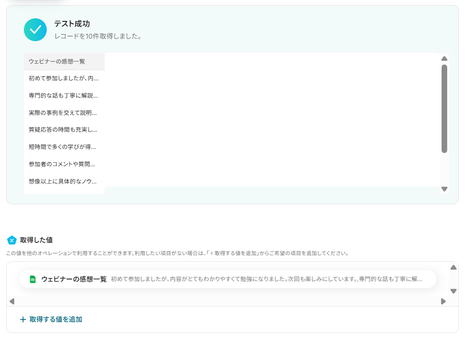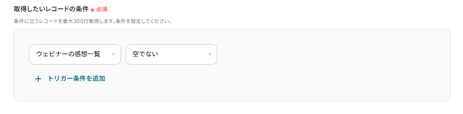 3)取得したいレコードの条件は「ウェビナーの感想一覧」「空でない」としています。