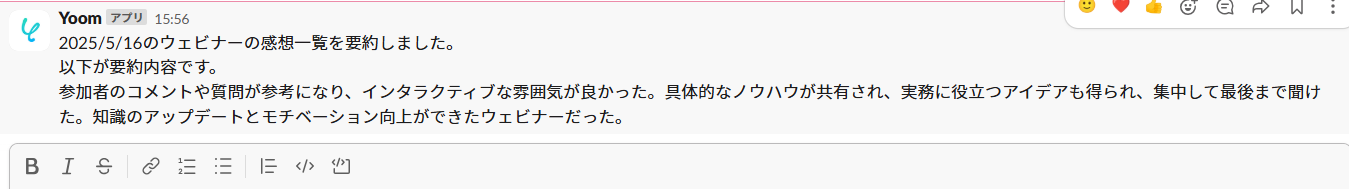 AIによる自動要約とSlackへの通知を組み合わせることで、集計・報告にかかる作業時間を削減しつつ、情報共有のスピードと正確性を高めることができます。