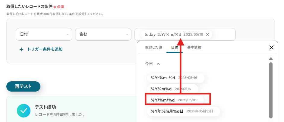 ※なお、事前に準備したGoogle スプレッドシートに日付のデータを入れ、以下のように取得したいレコードの条件を指定すれば、指定した日の分だけを要約することもできます。