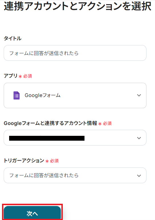タイトルと連携するアカウント情報を任意で設定し、トリガーアクションはテンプレート通りに「フォームに回答が送信されたら」のまま「次へ」をクリックして進んでください。