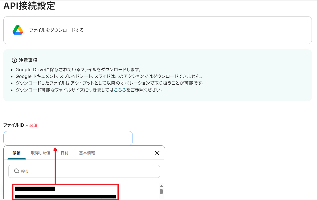 API接続設定という画面が表示されます。ステップ3で用意した添付ファイルのIDを選択してテストしてください。
