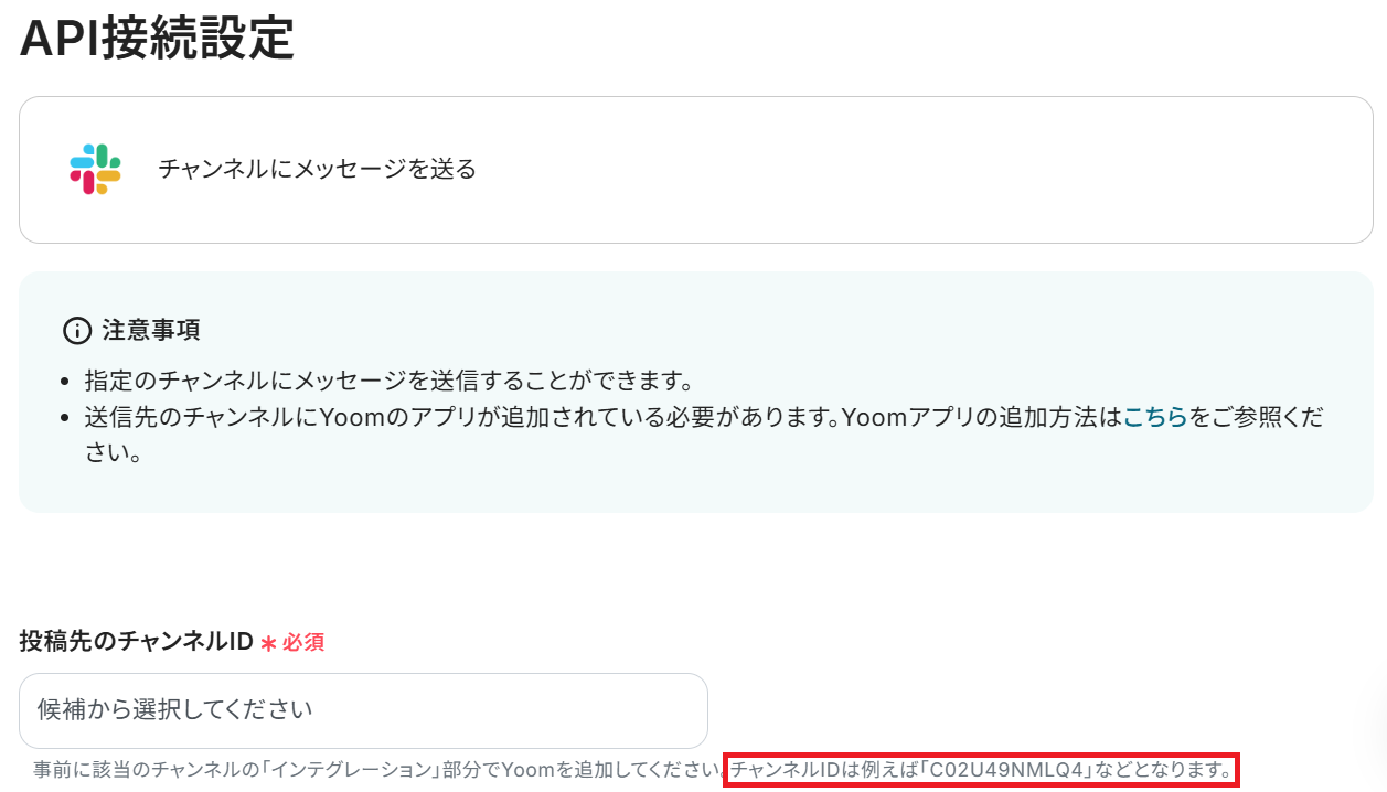 API接続設定という画面が表示されるので、まず投稿先のチャンネルIDを候補のプルダウンから選択してください。