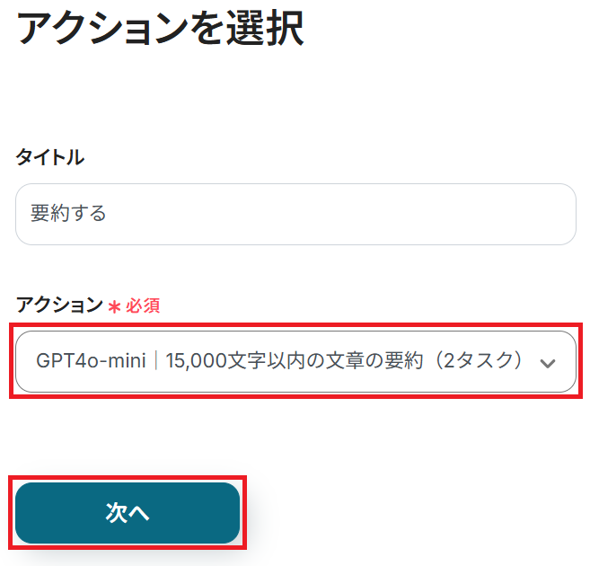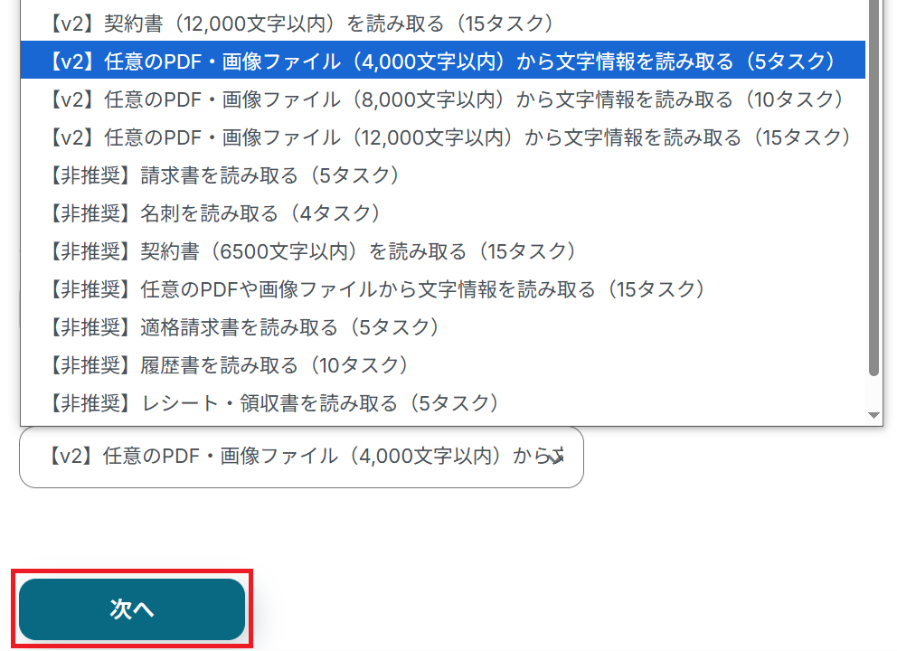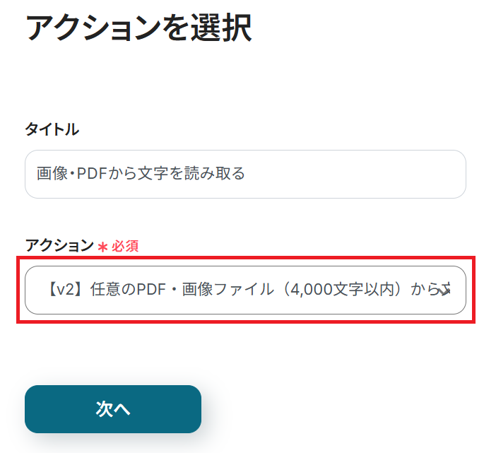アクションのプルダウンから読み取りたい内容を選択し「次へ」をクリックします。