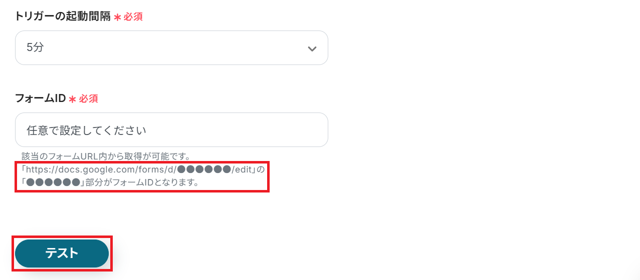 Googleフォームの用意ができたらYoomの設定画面に戻り、トリガーの起動間隔とフォームIDを入力してテストしてください。