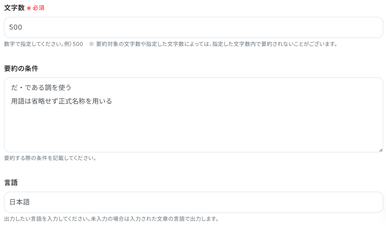 詳細設定に入ります。文字数、もしあれば要約の条件、必要に応じて言語を指定してテストしてください。今回は下記のように指定してみました。