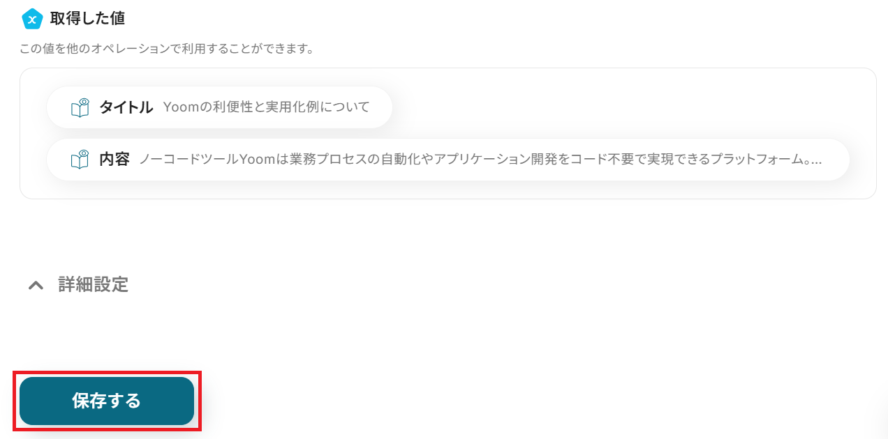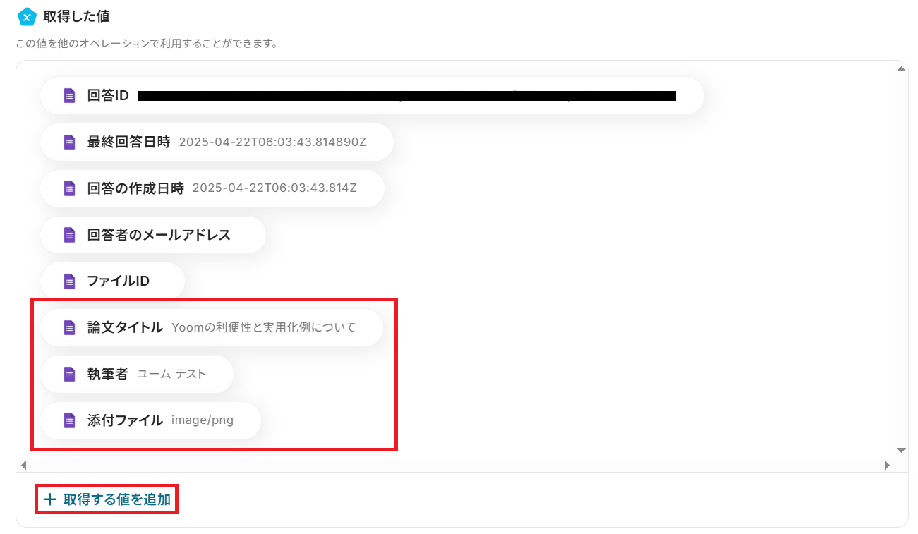 成功したら保存してください。今回は「+ 取得する値を追加」から手動で以下の赤枠の項目を追加しました!