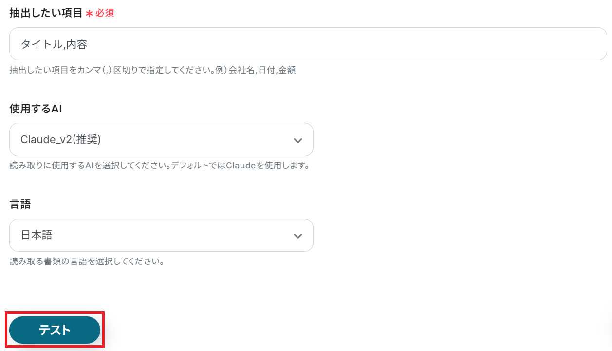 抽出したい項目や言語など、任意で変更することもできます。設定を確認したらテストしてください。