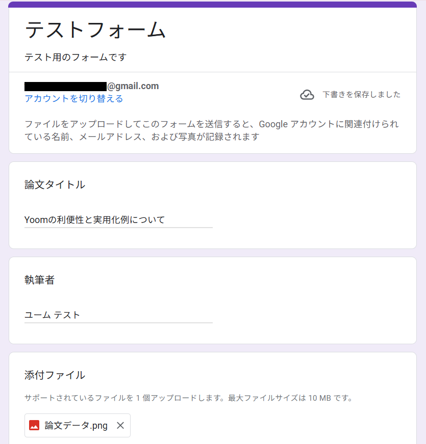 テストする準備として、フォームを作成して回答したものを用意してください。今回は例として以下のようなフォームを作り、自分で回答してみました。