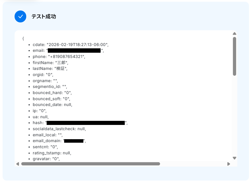 テストに成功するとテスト成功画面が表示され、取得した値が表示されます。