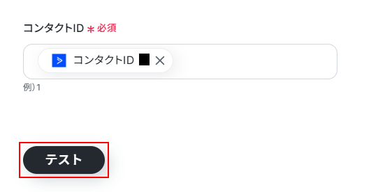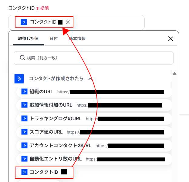 コンタクトIDはデフォルトで取得した値が設定されています。 項目名だけではなく、実際の値が表示されているのを確認してください。 取得した値を活用することで、固定値ではなく、トリガーが実行されるたびに最新の情報が反映できます。 また、取得した値は以下のように入力欄をクリックすることで設定できます。