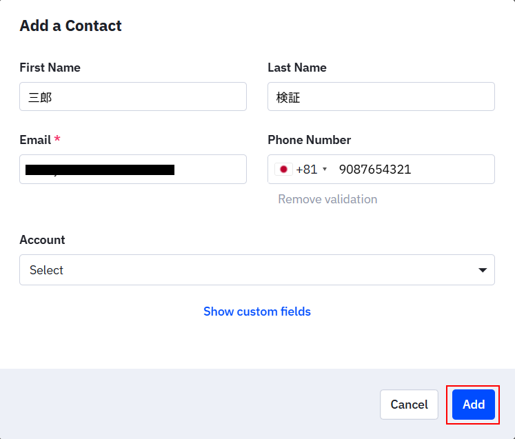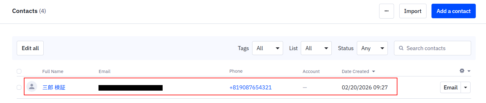 ActiveCampaignの画面に移動し、コンタクトを作成しましょう。 今回ご紹介するテンプレートはActiveCampaignにコンタクトが作成されたら起動します。 そのため、実際にテストを行うにはテスト用にコンタクトを作成する必要があります。 今回は以下のコンタクトを作成しました。