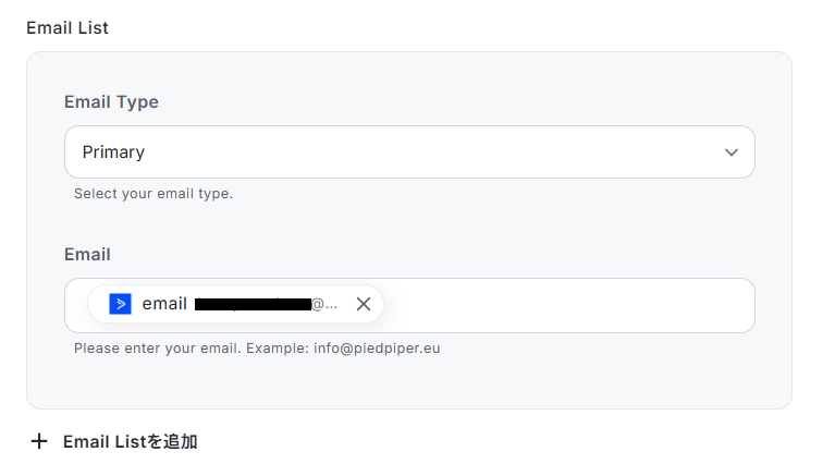 Email TypeにはデフォルトでPrimaryが設定されています。 変更したい場合はプルダウンメニューから選択してください。