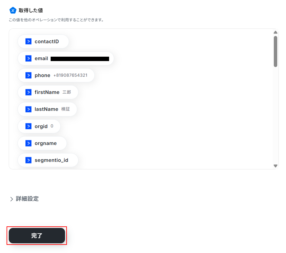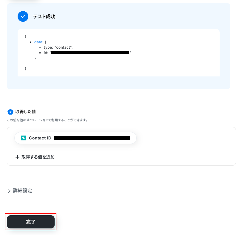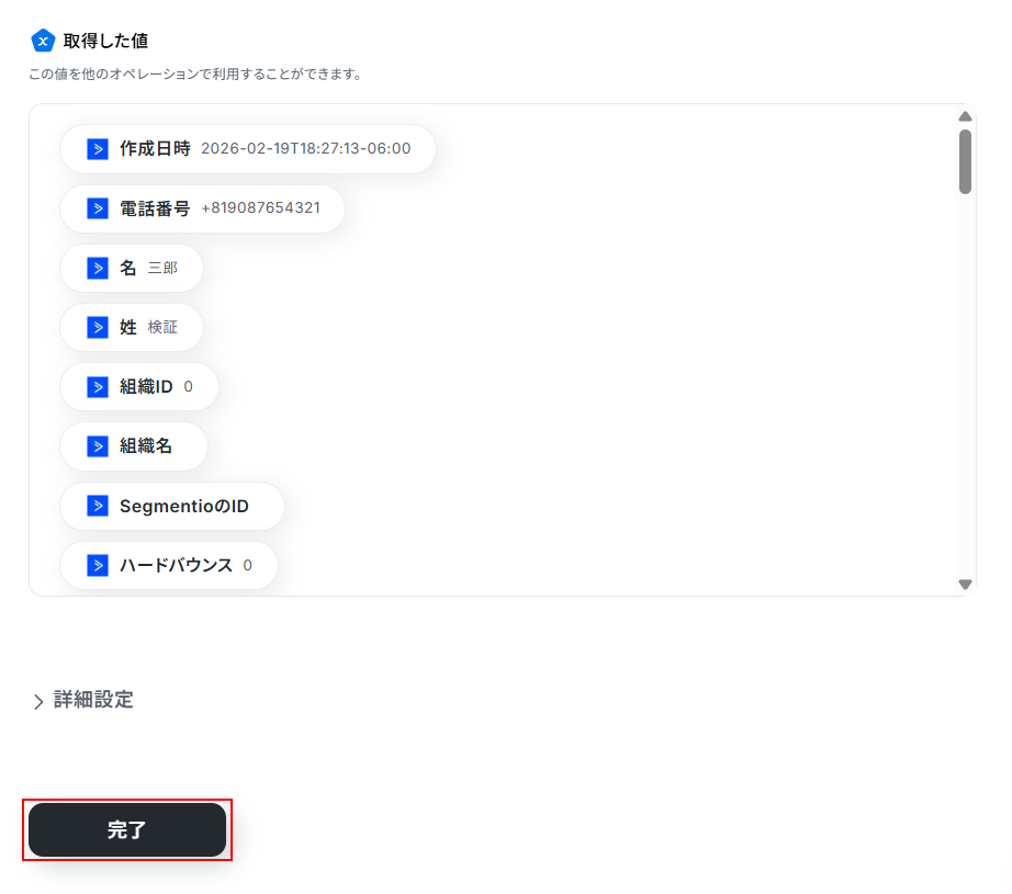 テストに成功するとテスト成功画面と取得した値が表示されますのでご確認ください。 確認できたら完了 をクリックしましょう。