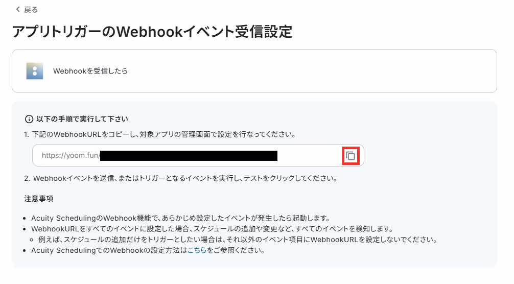 WebhookURLをコピーし、Acuity Schedulingの管理画面で設定を行いましょう。