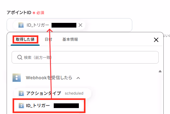 「アポイントID」は、ステップ3で取得したIDを「取得した値」から選択します。