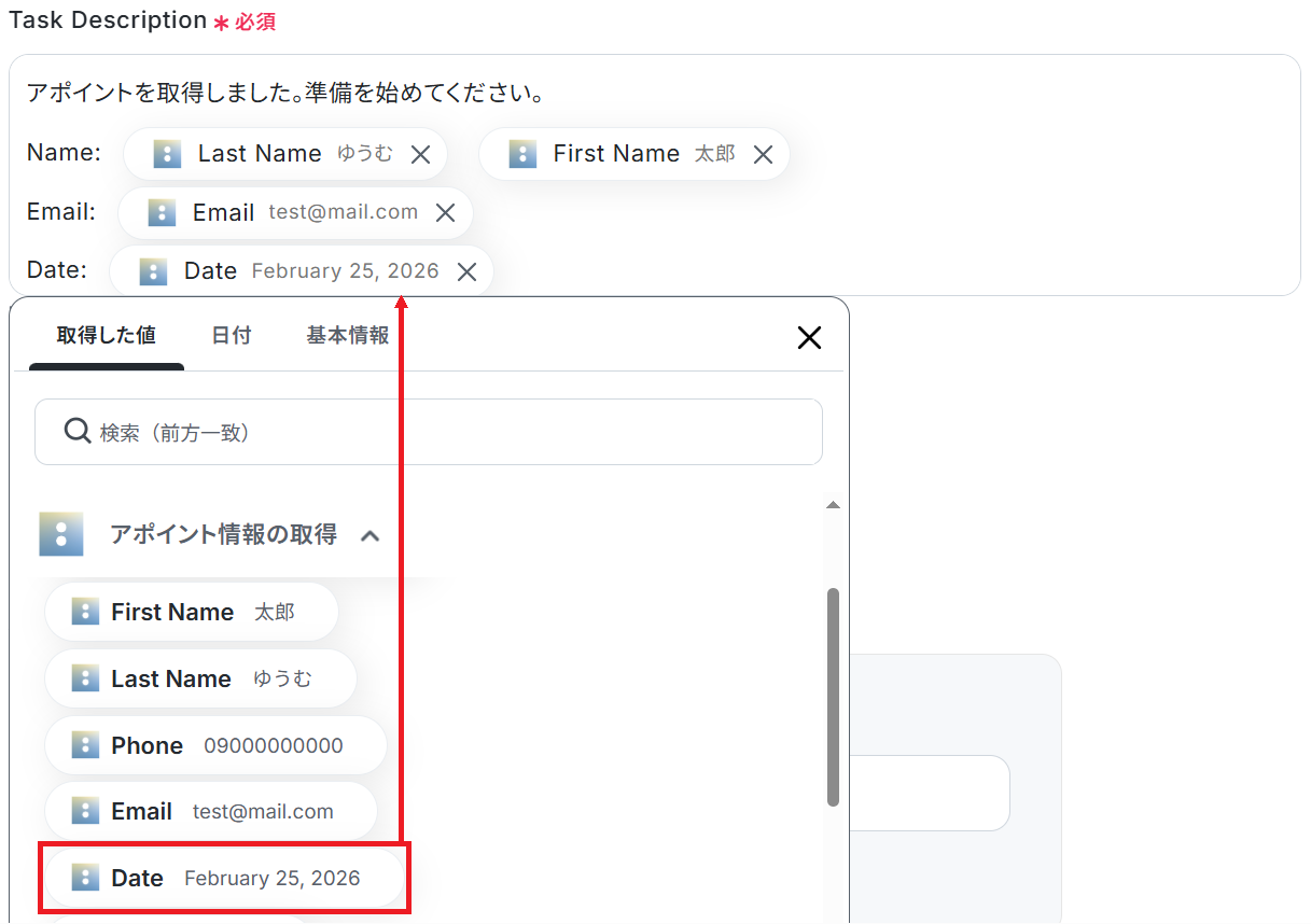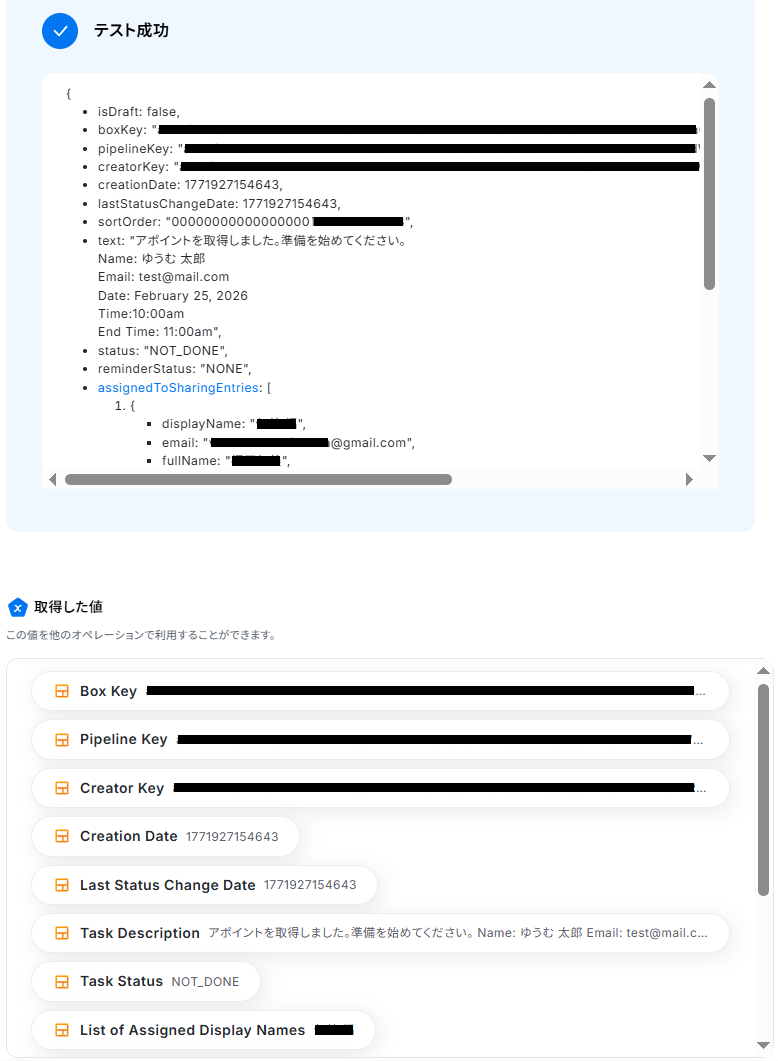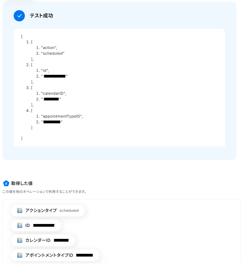 アポイントIDの欄には、トリガーで取得した「ID」の値が予め設定されているのでそのままテストしましょう。
