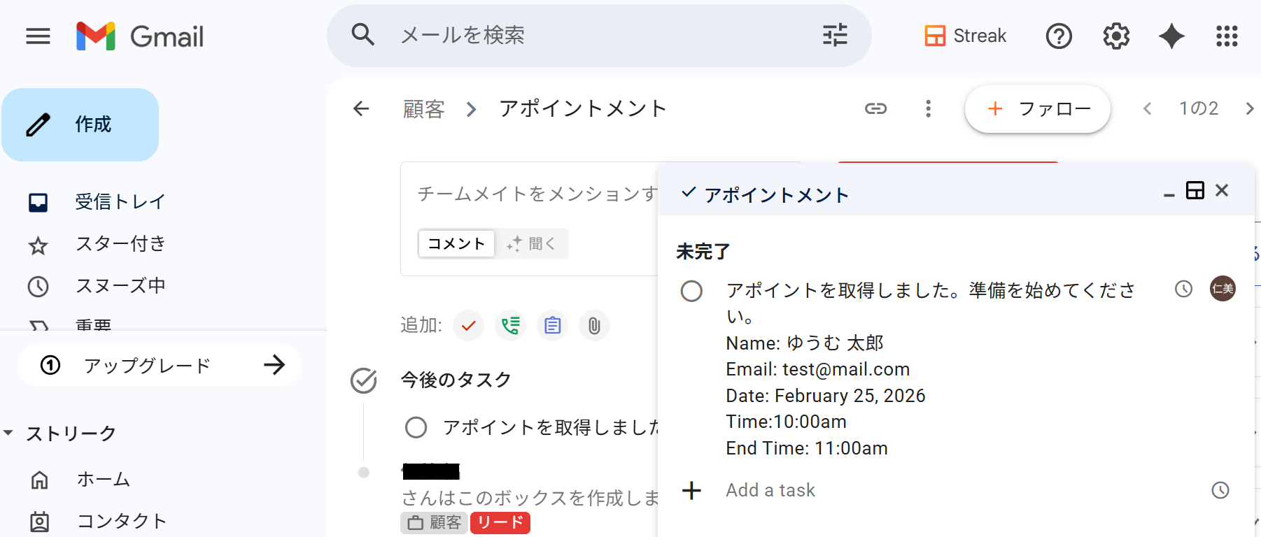 Acuity Schedulingの予約情報をもとに、Streakでタスクが作成されました!