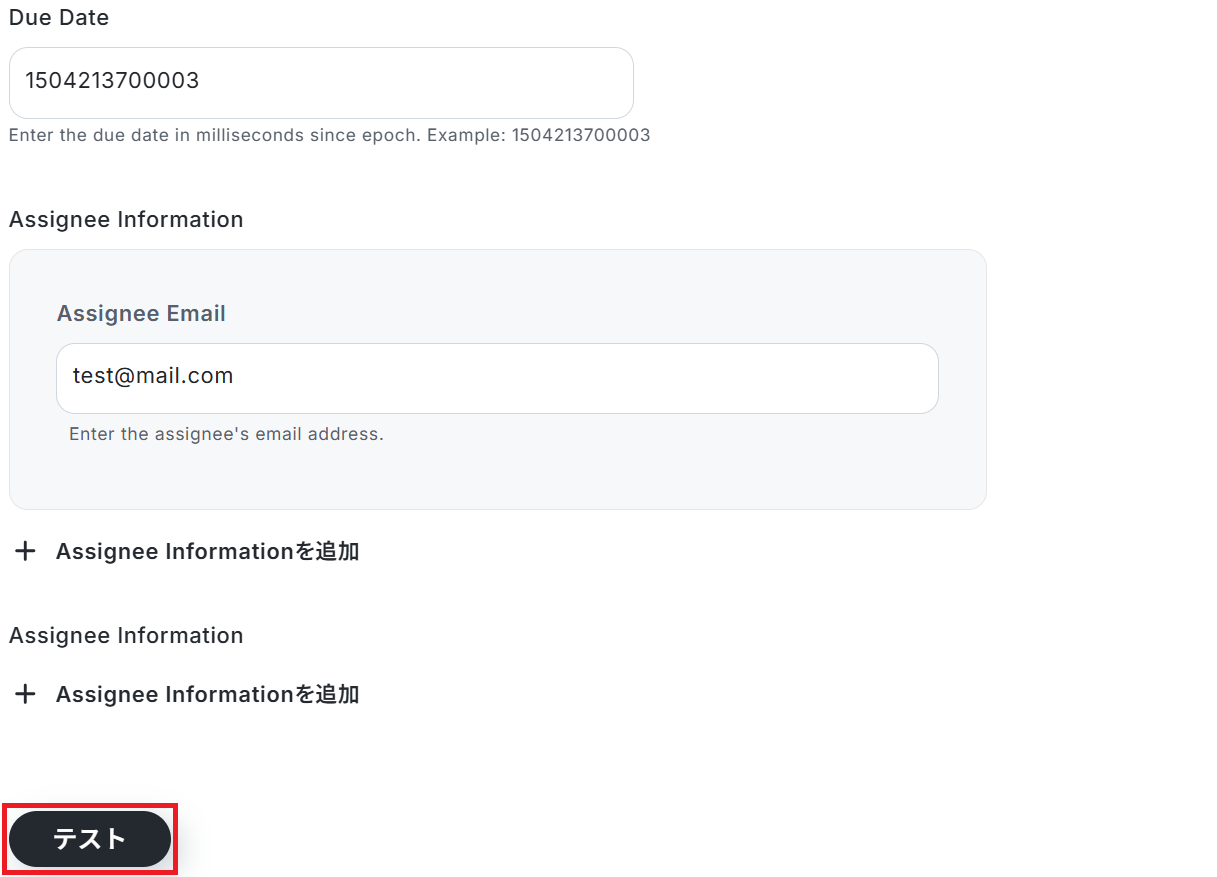 最後に任意でDue Date(期日)とAssignee Email(担当者のメールアドレス)を設定し、テストしましょう。