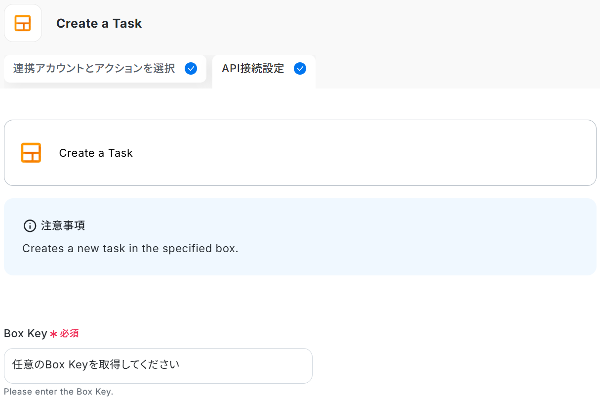 まず、タスクを作成したいBoxのBox Keyを入力してください。