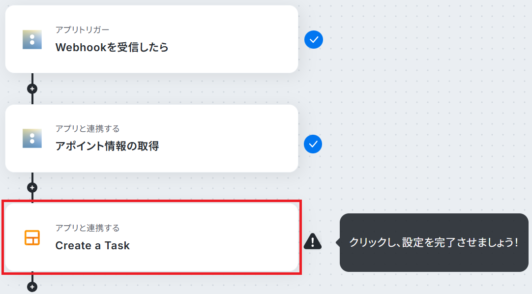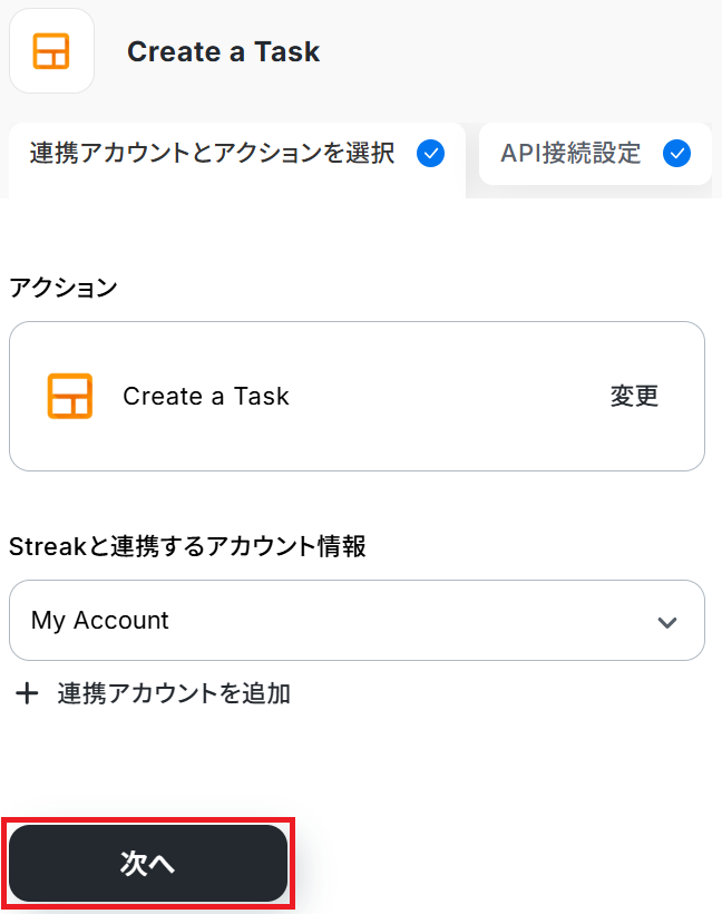 ステップ3・4と同様、アクションは「Create a Task」のまま「次へ」をクリックします。