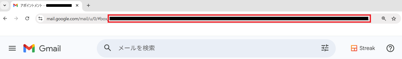 URL欄「https://mail.google.com/mail/u/0/#box/〇〇」の〇〇部分がBox Keyです。