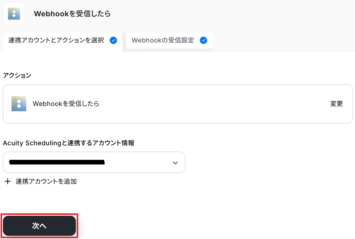 タイトルと連携するアカウント情報を任意で設定し、アクションはテンプレート通りに「Webhookを受信したら」のまま「次へ」をクリックします。