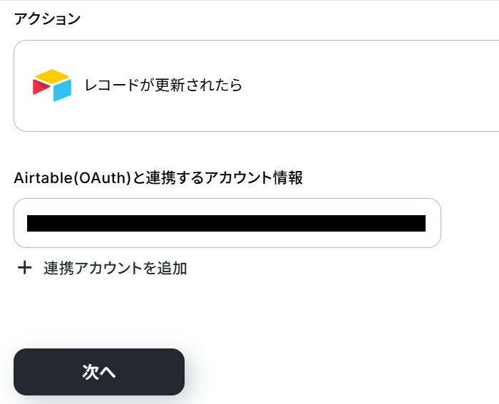 Airtableと連携するアカウント情報に誤りが無いか確認し、「次へ」ボタンをクリックしましょう。