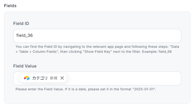 続いて、事前準備でテーブルを作成した際に、情報を入力しておいたフィールドの設定を行います。