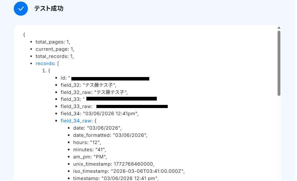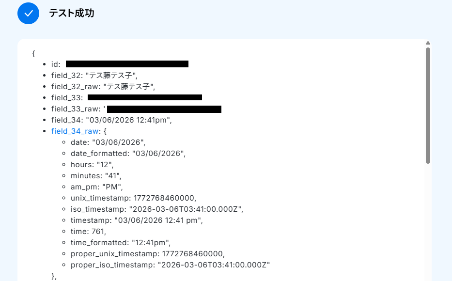 テストが成功すると、取得した値が表示されるので確認してください。
