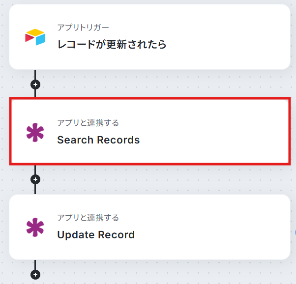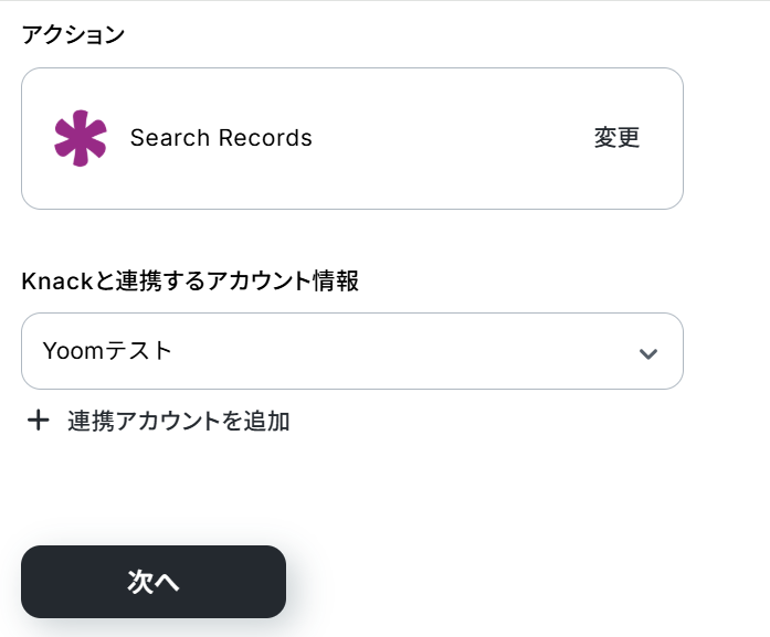 - 次に、オペレーションでKnackの「Search Records」アクションを設定し、更新対象となるレコードを検索します。