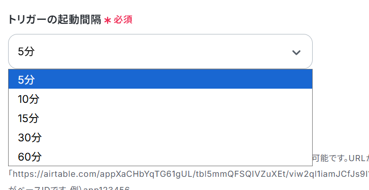 トリガーの実行間隔は、5分・10分・15分・30分・60分の中から選択して設定できます。