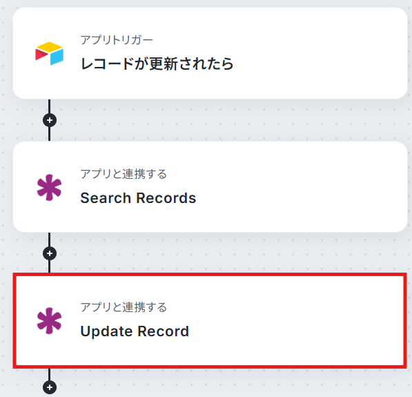 ステップ3で設定した、「レコードが更新されたら」の下部にある+ボタンをクリックし、「分岐する」オペレーションを追加しましょう。
