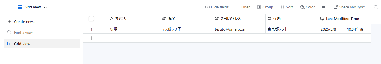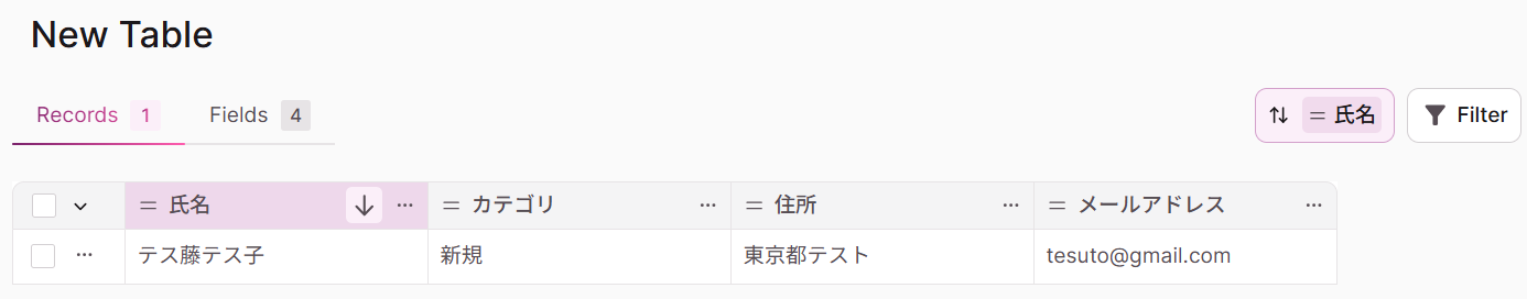 Airtableに更新したレコード情報をKnackに自動的に連携するために使用するテーブルを用意します。(テスト用に値も入れておきましょう!)