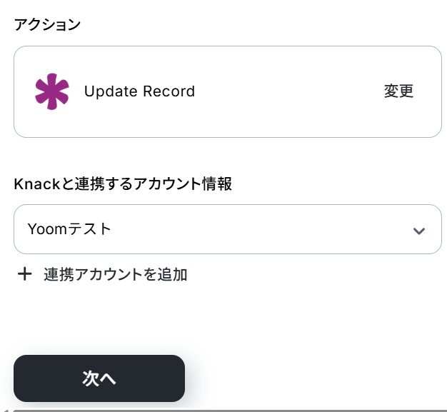 - 最後に、オペレーションでKnackの「Update Record」アクションを設定し、検索したレコードの情報を更新します。