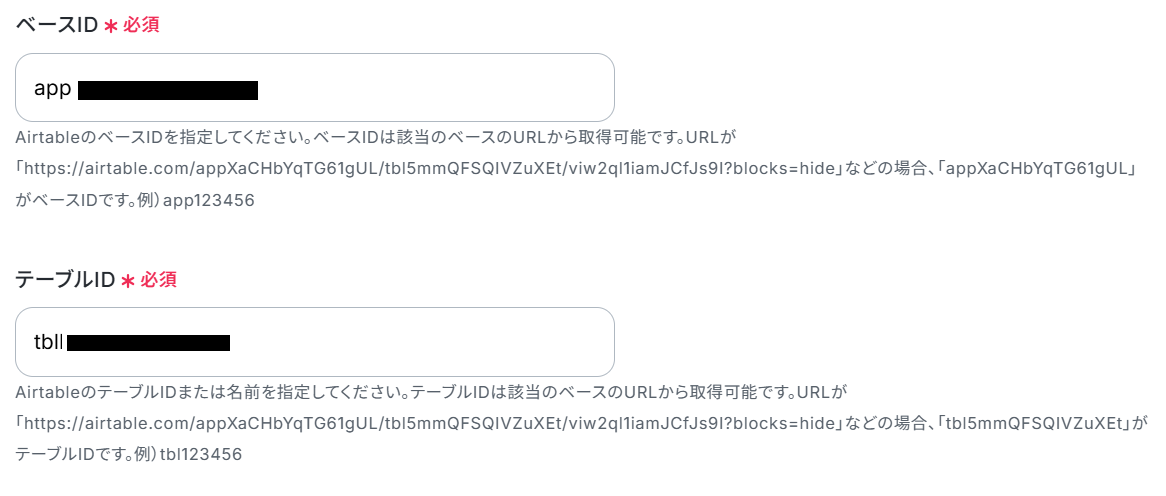 ベースID・テーブルIDは注釈を確認し、AirtableのURLから取得して設定しましょう。