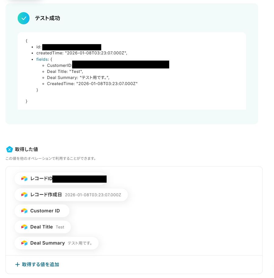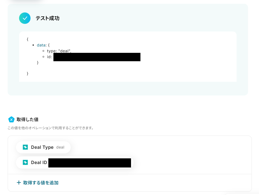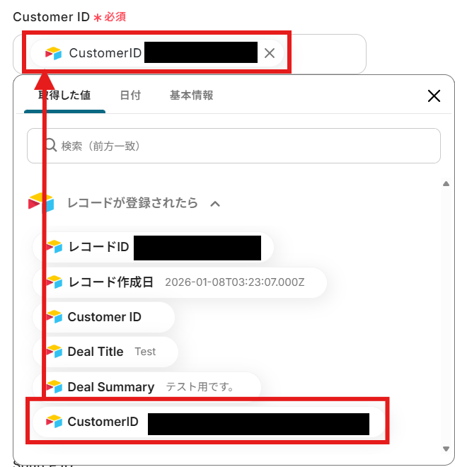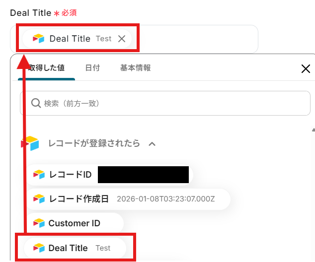 「Customer ID」と「Deal Title」を「取得した値」から設定しましょう。