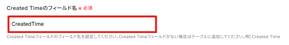 今回はテーブルのフィールドで「CreatedTime」と設定したので、「CreatedTime」と入力しています。
