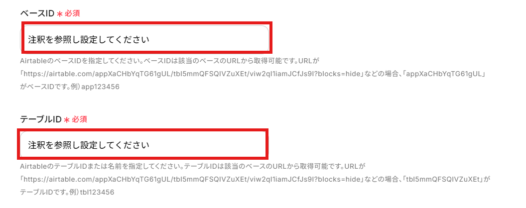 - Airtableのトリガー設定では、連携の対象としたい任意のベースIDとテーブルIDを指定してください。これにより、特定のデータベースのテーブルを監視することが可能になります。