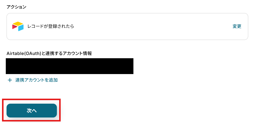 「Airtableと連携するアカウント情報」を確認し、「次へ」をクリックして進んでください。
