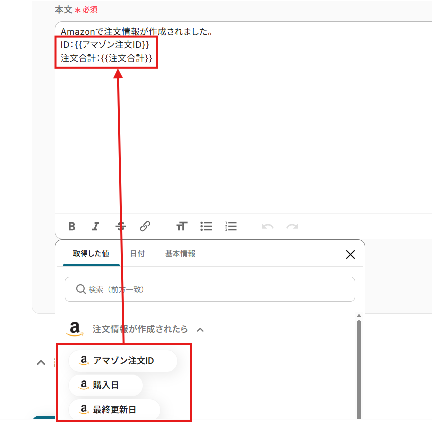 「本文」は、入力欄をクリックして表示される取得した値から選択してください。