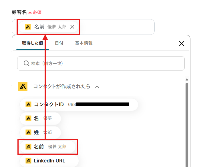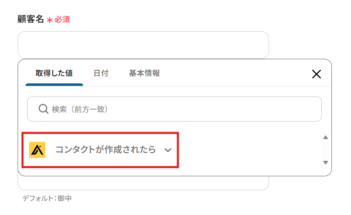 項目をクリックすると、入力欄に{{項目名 取得した値}}という形で追加されます。