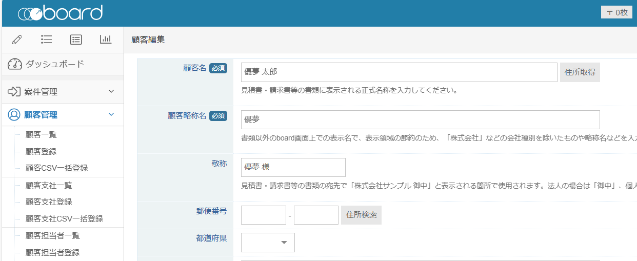 - boardの「顧客の登録」をクリック。